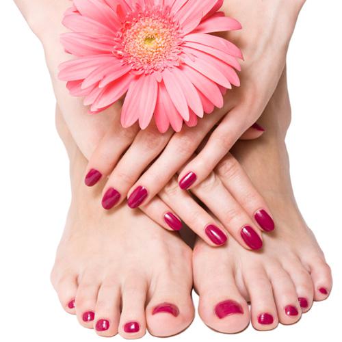 Bains de peid, traitement des callosités par ponçage ou gommage, soins des cuticules et limages des ongles.